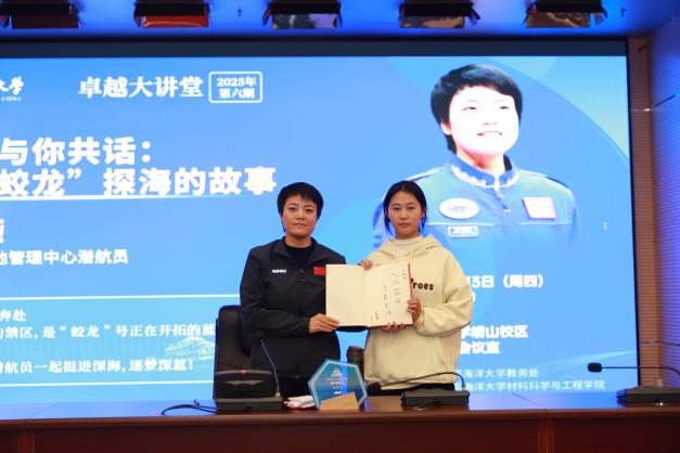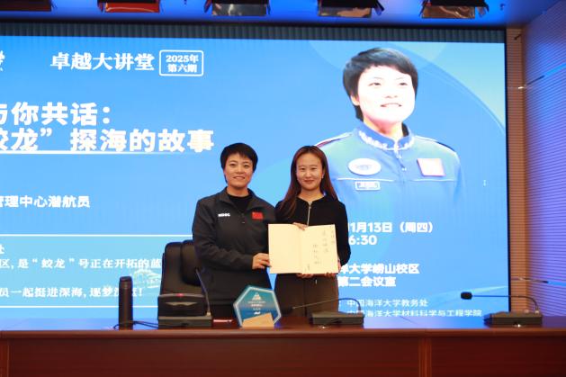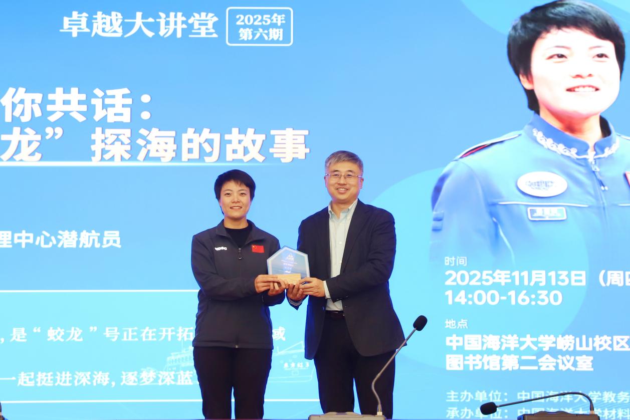 11月13日,卓越大讲堂2025年第6期在中国海洋大学崂山校区举办。本期活动特邀国家深海基地管理中心“蛟龙”号载人潜水器潜航员、纪委委员赵晟娅,围绕“我与‘蛟龙’探海的故事”作专题报告。