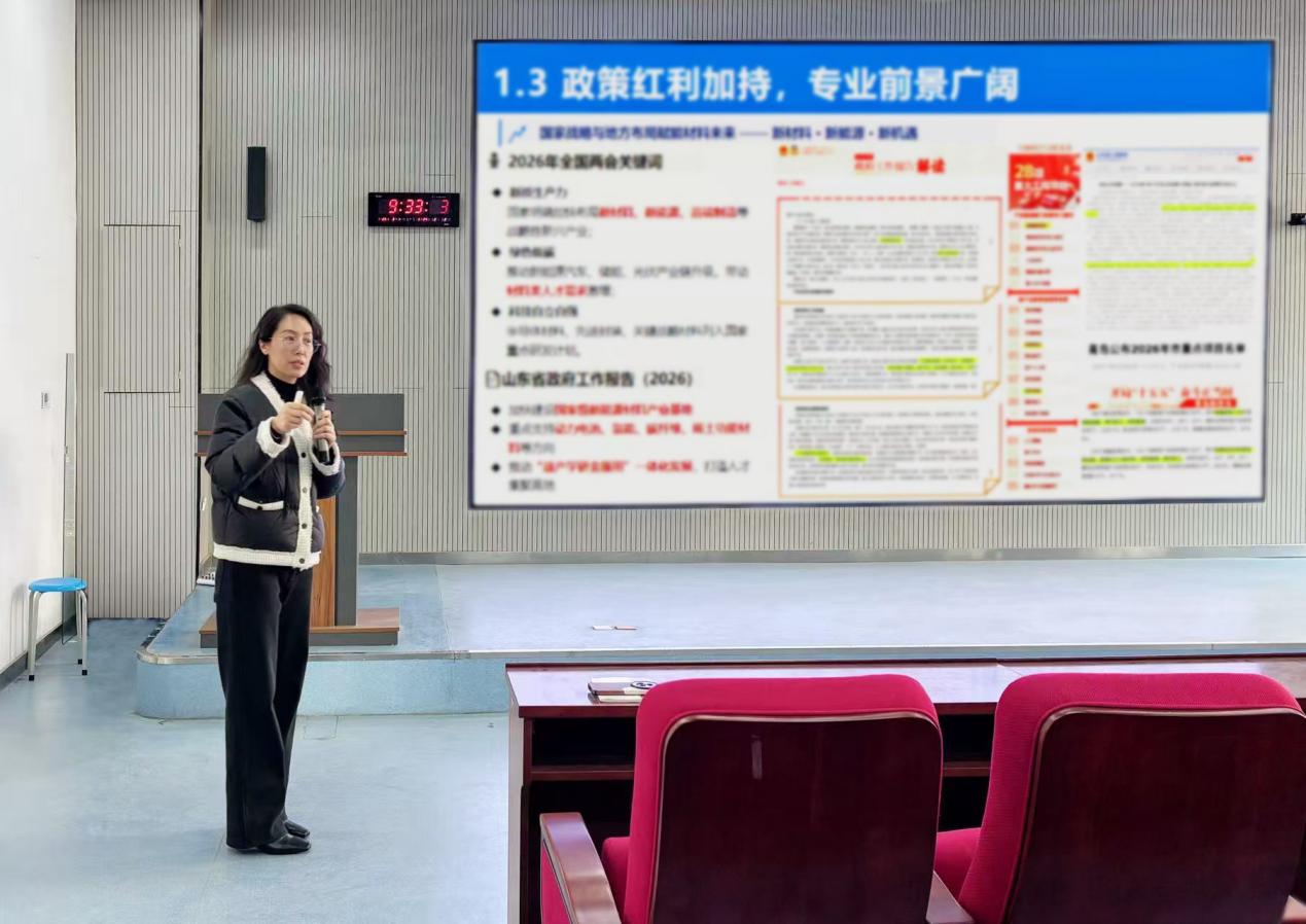 为落实上级及学校就业工作部署,帮助同学们把握就业形势、明确发展方向、提升求职能力,3月12日上午,材料科学与工程学院党委副书记、副院长呼双双在材料楼102学术报告厅为2026届毕业生讲授2026年春季学期就业第一课。