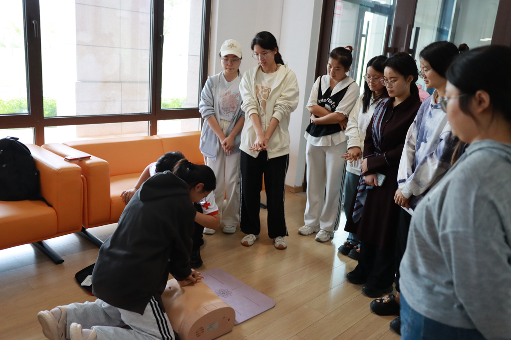 在接下来的实际教学过程中,他们采用“理论讲解+现场演示”的模式,围绕气道异物梗阻的现场处理、心搏骤停及生存链、心肺复苏和自动体外除颤器的使用三大核心模块展开实操教学,通过清晰的动作示范和细致的要点讲解,让同学们对这些急救技能有了更加直观的理解。