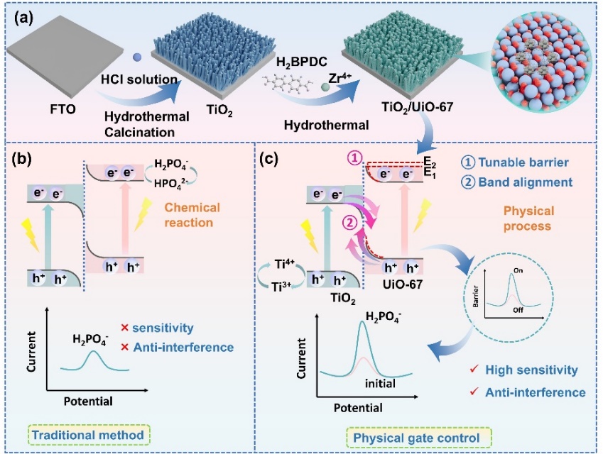 图1. 基于物理门控S型异质结的制备及其磷酸盐传感机制示意图