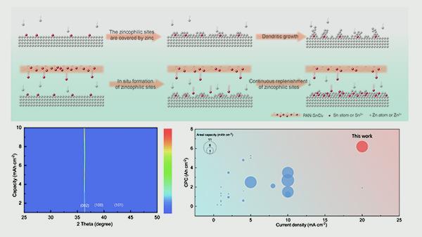 Additionally, the team proposed a dynamic interfacial alloying strategy to achieve adaptive interface regulation through controlled ion release. This strategy employs an electrospun composite interfacial film of stannous chloride and polyacrylonitrile, which gradually releases tin ions that are in situ reduced to metallic tin on the anode surface. Subsequent zinc deposition promotes the continuous formation of zinc-tin alloys, replenishing zincophilic sites and inducing epitaxial growth of the Zn(002) plane. This alloyed interface also accelerates the reduction of tin ions in local defect areas, guiding preferential zinc deposition and repairing structural integrity, thereby significantly enhancing the reversibility and stability of the anode. Batteries based on this strategy achieved an areal capacity of 3.5 mAh cm⁻² and stable cycling for over 1,000 cycles. The related research, titled Dynamic Interfacial Alloying for Highly Reversible Zinc Anodes, was published in Advanced Functional Materials. The first author of the paper is Wang Xingjie, a 2023 doctoral student from the College of Materials Science and Engineering.