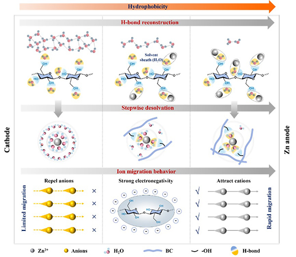 The research team also developed an ultrathin hydrophobic gradient cellulose separator with a thickness of only 18 μm. Leveraging the synergistic effects of its hydrophobic gradient structure and surface negative charges, this separator effectively blocks chloride ion penetration and reduces interfacial water activity. It not only constructs a stepwise desolvation path for hydrated zinc ions and promotes the formation of highly aggregated electrolytes to suppress side reactions but also repels chloride ions and homogenizes zinc deposition through electrostatic shielding, further enhancing the battery's cycling stability. The zinc anode using this separator achieved a long cycle life of 2,900 hours in natural seawater electrolyte and stable operation for 1,300 hours at 50% DOD. The assembled full cell exhibited a volumetric energy density of 233.1 Wh L⁻¹ (N/P = 2.3). This separator technology provides critical material support for marine energy storage systems. The related findings were published in Advanced Functional Materials under the title Hydrophobicity Gradient in Ultrathin Cellulose Separators for Durable Seawater-Based Zinc Batteries. The first author of the paper is Dong Yanying, a 2023 doctoral student from the College of Materials Science and Engineering.