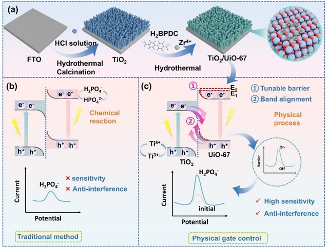 With the advancement of the country's Maritime Power construction, establishing a real-time online monitoring system for Marine pollutants has become a major demand. However, due to the high salinity, complex background ions and variable environmental conditions in seawater, traditional sensors often find it difficult to achieve accurate detection. This leads to significant deficiencies in the selectivity and anti-interference ability of the existing electrochemical sensors. In response to this challenge, the research team innovatively designed a highly anti-interference sensing interface based on TiO₂/ UiO-67S type heterojunction band engineering. This interface uses physical gating as the trigger factor to precisely regulate the band alignment of the heterojunction, significantly enhancing the specificity of phosphate detection. Mechanically, the adjustable contact barrier of the S-shaped heterojunction not only optimizes the interfacial energy level structure but also promotes the efficient separation of photogenerated carriers, achieving a strong specific response to phosphate ions in the complex background of seawater. Experiments show that the detection limit of this sensor for phosphate is as low as 43 pM, and it maintains signal stability under the coexistence of interference ions with a concentration of ten thousand times. This research provides a new solution for developing highly reliable Marine environment monitoring technologies. The relevant paper is titled Band Alignment in TiO₂/UiO-67 S-Scheme Heterojunction for Anti-Interference Phosphate. Sensing (Research on Band Alignment of TiO₂/ UiO-67S Heterojunction for High Anti-Interference Phosphate Sensing) was published in the top journal in the field of Materials, Advanced Functional Materials. The first author of this paper is Guo Rong, a doctoral student from the School of Materials Science and Engineering.