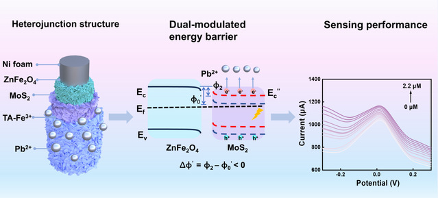 Meanwhile, the research group proposed a photoelectric and electrostatic synergistic strategy to construct a dual-modulation energy barrier to achieve specific capture and detection of lead ions. This strategy employs the ZnFe2O4/MoS2@TA-Fe3+ dual-driven heterojunction sensing interface, which triggers electrostatic field reconstruction through the directional migration of photogenerated carriers and the specific adsorption of Pb²⁺. Dynamic energy barriers precisely avoid REDOX competitive reactions; Simultaneously screen out high-concentration interfering ions. Experiments show that the sensitivity of this sensor to Pb²⁺ is as high as 80.5 μA μM-1 cm-2, and lead detection at 37 nM is achieved in actual seawater samples. This research provides a breakthrough technical solution for on-site monitoring of Marine heavy metal pollution. The relevant paper is titled Anti-interference detection of Pb (II) in seawater enabled by a photo-electrostatic ZnFe2O4/MoS2 heterojunction. electrode (Anti-interference Detection of lead (II) in Seawater Using Photoelectrostatic ZnFe2O4/MoS2 heterojunction electrode) was published in the top Journal Chemical Engineering Journal in the field of chemical engineering. The first author of this paper is Huo Shu, a master's student from the School of Materials Science and Engineering.
