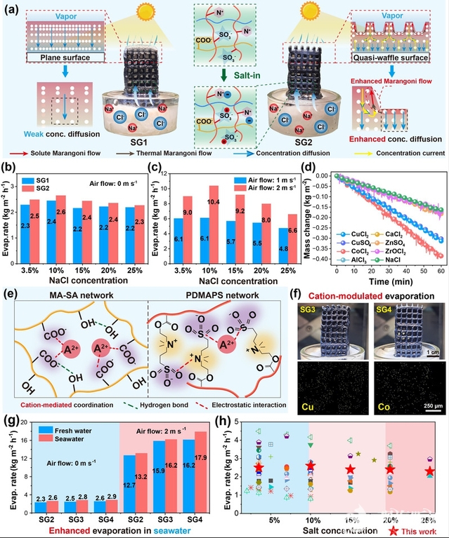 The printing paths for three types of printing needles were customized. The three-dimensional structures were modeled by using the multi-layer superposition method, and the planar surfaces and Waffle surfaces were designed. The lattice structure with a waffle pattern surface and multi-scale stratified pores significantly increases the effective evaporation area, enabling better utilization of sunlight, air flow and environmental energy. The introduction of amphoteric ions in seawater has produced a significant anti-polyelectrolyte effect, shielding the interaction between polymer chain segments and exposing more ionic groups to interact with water molecules. The strong solvation effect of divalent cations also weakens the hydrogen bonds of water molecules and disrupts the original water molecule structure. These synergistic effects increased the intermediate water content, thereby accelerating the evaporation of 3D SGs. Under one sun and a wind speed of 2 m s−1, the maximum evaporation rate of 3D SGs in seawater reached 17.9 kg m−2h−1, which was 10.5% higher than that in fresh water under the same conditions and six times that in windless conditions. Even in 25% salt water, the evaporation rate could still be maintained at 6.6 kg m−2h−1. Stable and efficient water evaporation was achieved under a wide salinity range (3.5-25%) conditions (Figure 2).