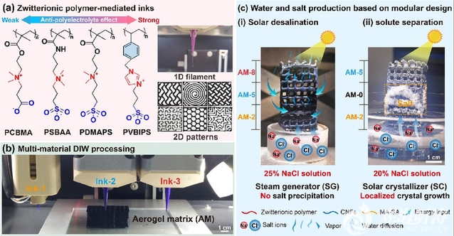 Figure 1. In this study, the design of photothermal ink for direct writing of multi-material ink and the printing and preparation of hierarchical structure printing of photothermal composites for desalination and crystallization of concentrated brine water.
