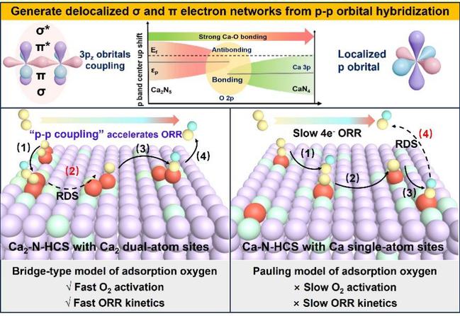 Figure 1 Schematic diagram of the mechanism of p-p orbital coupling to enhance ORR activity in alkaline earth metal calcium-based diatomic catalyst (Ca2–N–HCS).