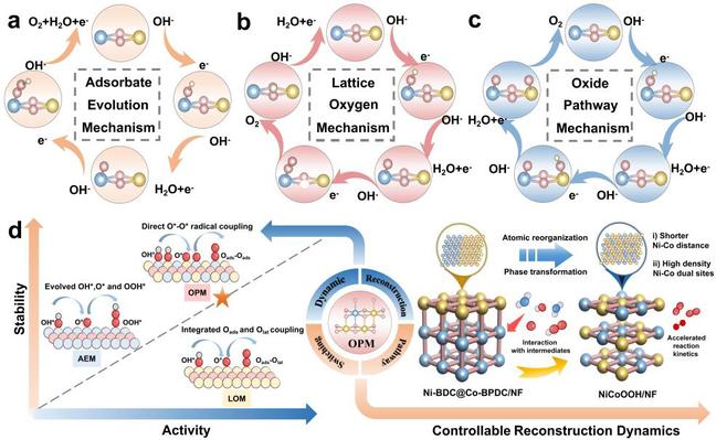 In parallel, addressing the unclear evolution of active sites and pathway selection in OER, the team constructed a self-adaptive Ni–Co-based MOF-on-MOF catalyst, which undergoes in situ reconstruction into a NiCoOOH active phase with high-density, short-range Ni–Co dual sites during OER. This transformation induces a shift in the OER pathway from the conventional adsorbate evolution mechanism to a lattice oxygen mechanism (Fig. 2). The catalyst requires an overpotential of only 301 mV at 1 A cm⁻² and operates stably for over 1,000 hours. When assembled into an anion exchange membrane alkaline electrolyzer, it achieves stable operation at 1.77 V and 1 A cm⁻² for more than 240 hours.