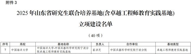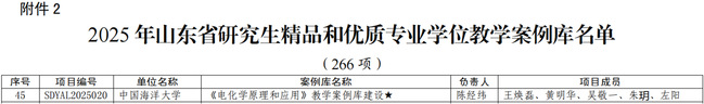 Among them, the graduate course “Marine Equipment Materials,” led by Dean Cui Hongzhi, was recognized as a Shandong Provincial High-Quality Graduate Course (one of only two selected university-wide). The Ocean University of China – Ningbo Branch of China Academy of Ordnance Science Excellence Engineer Education Practice Base was approved as a Provincial Excellence Engineer Education Practice Base (the only one selected university-wide). In addition, the teaching case repository “Principles and Applications of Electrochemistry,” led by Associate Professor Chen Jingwei, was included in the Shandong Provincial High-Quality Professional Degree Teaching Case Repository (one of eleven selected university-wide).