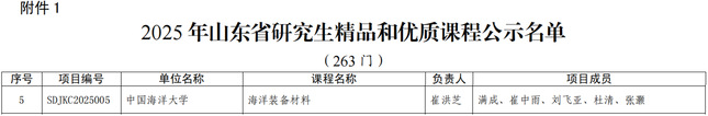 Recently, the Shandong Provincial Department of Education announced the list of approved projects for the 2025 Provincial Graduate Education Quality Resource Programs. The School of Materials Science and Engineering achieved notable success with three selected projects. Among them, the graduate course “Marine Equipment Materials,”led by Dean Cui Hongzhi, was recognized as a Shandong Provincial High-Quality Graduate Course (one of only two selected university-wide). The Ocean University of Chi