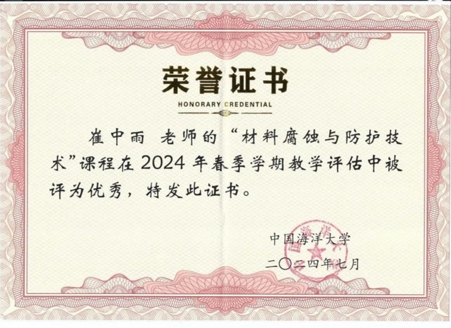 He remains committed to the original aspiration of educating talents for the Party and the country, integrating national pride and the latest scientific research into teaching, and dedicating himself to nurturing a new generation of talents in materials science. He focuses on scientific research, scaling new heights, and tackling key corrosion challenges in extreme marine environments. He insists on writing his papers on the land of the motherland, actively promoting the transformation of resear
