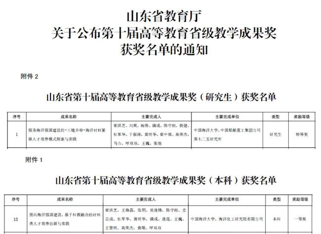 Recently, the winners of the 10th Shandong Provincial Teaching Achievement Awards (Higher Education) were officially announced. The School of Materials Science and Engineering achieved outstanding results with two award-winning projects led by Dean Cui Hongzhias the principal contributor. The project titled “Exploration and Practice of a ‘Three-Chain Integration’ Talent Cultivation Model for Marine Materials in Support of National Ocean Strategy”was awarded the Grand Prize (graduate education